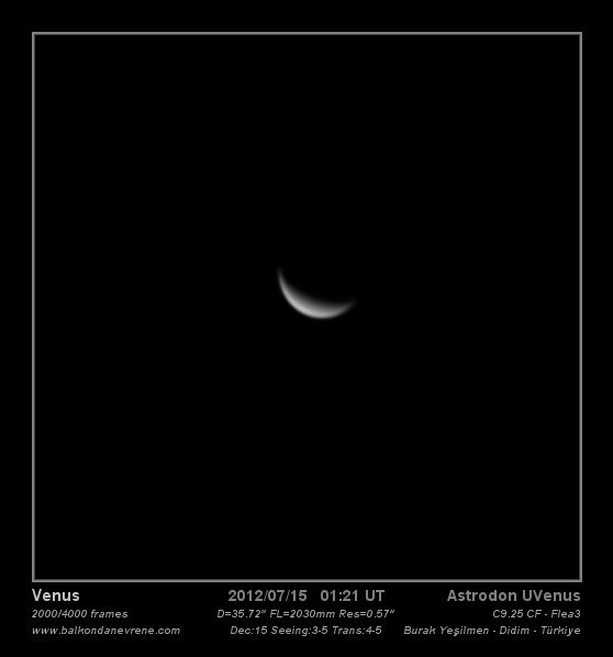 15 Temmuz Jüpiter-Ay örtmesi olayını görüntülemek için ekipmanı hazır kurmuşken Türkiye Saati ile sabah 04:21′ de ufuktan yalnızca 10 derece yükseklikteki Venüs’ ü de çekmek istedim. Hilal evresi dışında bir atmosfer-bulut detayı bu yükseklikte yakalamak oldukça zordu zaten. Sonuç olarak böyle sade bir Venüs’ ümüz olmuş oldu.