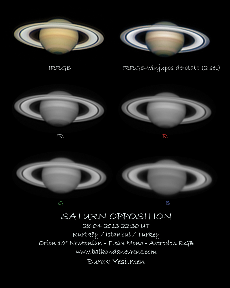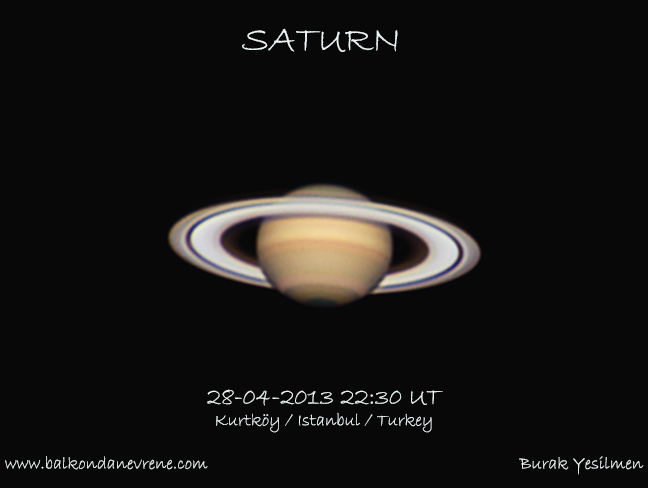 Sevgili Burak eline sağlık, çok güzel bir Satürn olmuş. Fotoğrafta bie güney kutup bölgesini gösteriyor değil mi? Gezegenin eğimi de uygun olduğu için halkalar sanki dünyamıza bakarak poz vermiş.