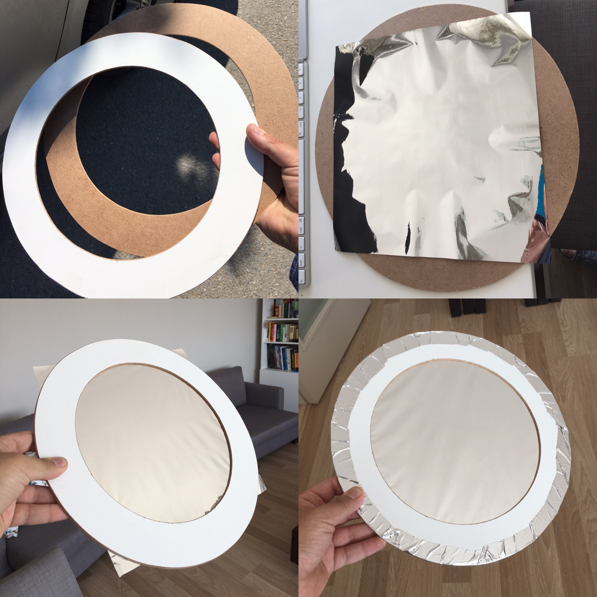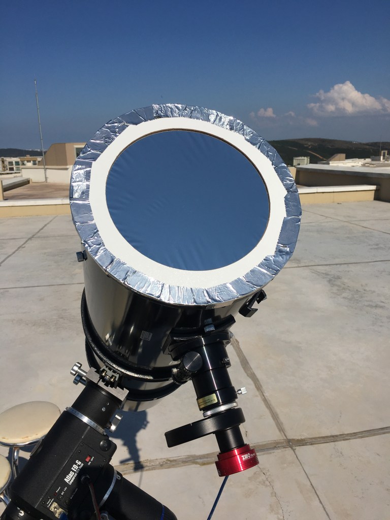 Gözlem öncesi hazırlık amacıyla oluşturduğum “yapılacaklar listem” tek tek tamamlanıyordu. Şimdi sırada yeni aldığım ve ışık geçirgenliği daha önce kullandığım gözlem amaçlı olan Baader ND5.0 Visual Güneş filtresine göre daha fazla olan Baader ND3.8 Photographic filtreme eskisi gibi bir hücre yapmak vardı. Hemen aynı marangoz kardeşimin kapısını çaldım ve fotoğrafta görülen 2 çemberi hafif ama dayanıklı bir malzemeden kestirdim. (Sanırım kontraplak)